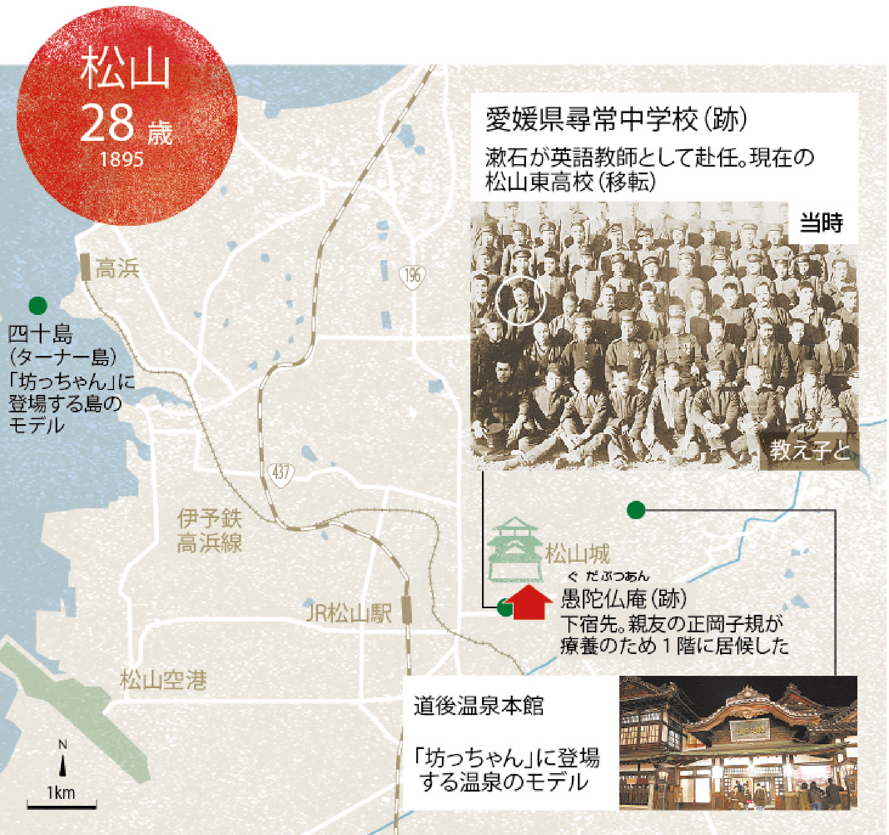 1895(明治28)年、漱石は愛媛県尋常中学校(現・松山東高校)に英語教師として赴任した。坊っちゃんの主人公も「四国辺のある中学校」に赴任した設定だ。