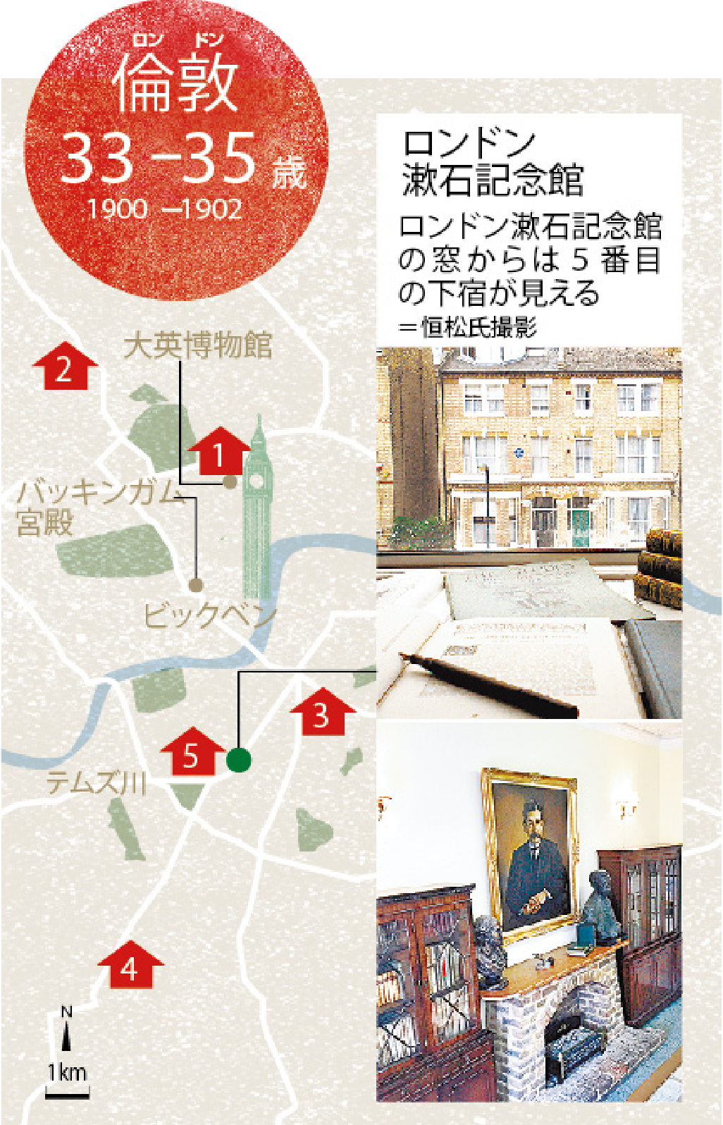 ロンドン漱石記念館は84年に、下宿の真向かいに開館した。館内には留学当時の市内の古い写真や、下宿、観劇のプログラム、それに個人教授を受けたクレイグ先生、カーライル博物館で漱石を案内したストロング夫人、下宿のリール姉妹などの写真や資料を展示してある。(同記念館は16年に閉館)