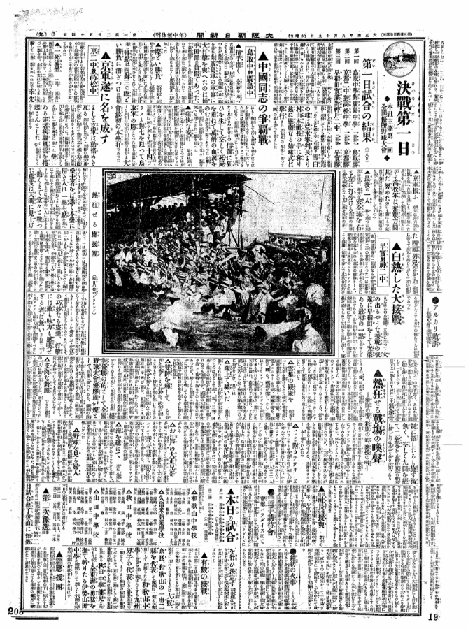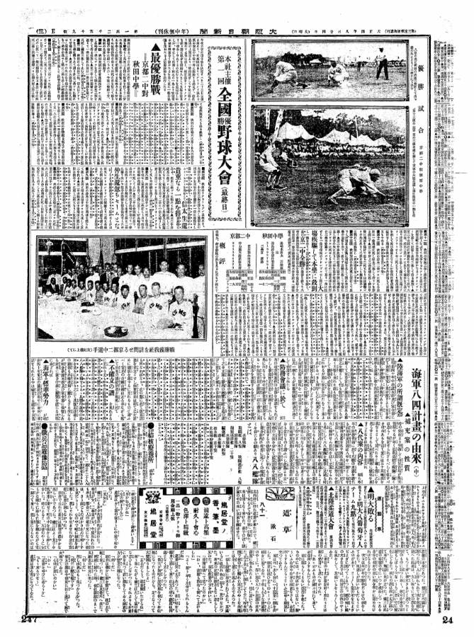 大会は京都二中が秋田中(現秋田)を破り、優勝旗を手にした。京都二中の三塁手として戦後初の第28回大会(46年)に出場した黒田脩さん(85)は、第1回に出場したメンバーに指導を受けた。「私たちは第1回の優勝校として常に見られてきた。誇りに思う」 (2015年1月3日付本紙から)