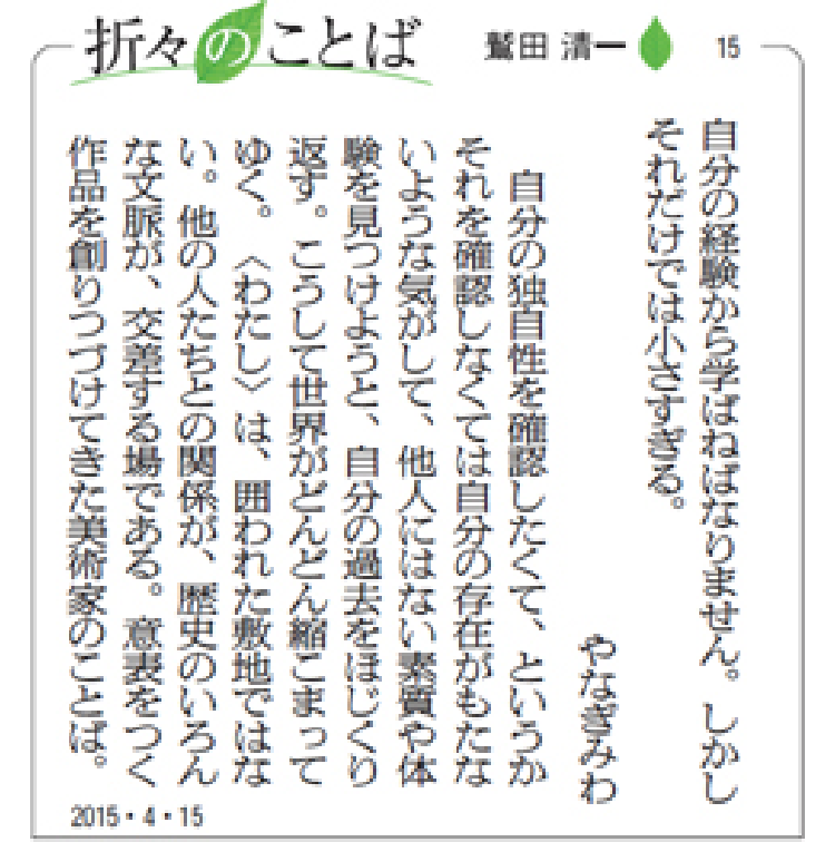 ズバッと直球のことばです。美術家のやなぎみわさん(同4月15日)なんかそうですね。この春の大学の入学式でも式辞で紹介しました。
