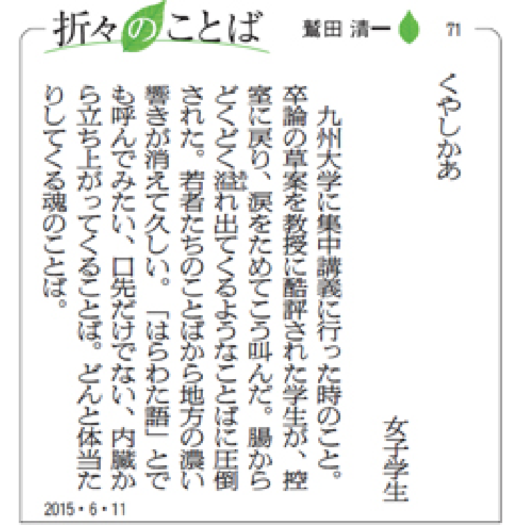 なぜこのことばに引かれたのだろうと考えながら、書いています。意味だけでなく、口調やリズム、肌触りに、じんとくることがあるんです。九州の女子学生の「くやしかあ」(同6月11日)という叫びなどはその例ですね。