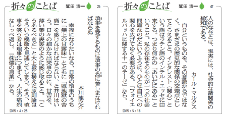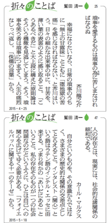 最近は、「あんなことばがあったはずだ」と、書棚の奥の古い本を捜すことも増えました。大学時代に読んで40年以上開いていなかった芥川龍之介(同4月25日)やマルクス(同5月18日)も引っ張り出しました。二度と読まないだろうと思っていた本を開き、今になって書かれていることの意味がわかることがあります。ことばの意味が本当にわかるには、時間がかかるのだと思います。